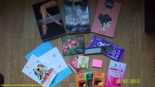Jakiś czas temu zgłosiłam się do pewnej wymiany organizowanej z okazji zbliżających się Walentynek. Mowa tu o akcji z miłością w tle. O co dokładnie chodziło? W wyznaczonym terminie należało się zgłaszać, jeśli było się chętną osobą na wymianę, a potem organizatorka wyznaczyła dla każdego parę, do której należało wysłać paczuszkę z walentynkowymi niespodziankami. W paczce miły znaleźć się: książka (albo książki) z motywem miłości, umilacze czytania, coś akcentującego Walentynki (kartka walentynkowa bądź inny drobiazg) oraz jakiś list/kartka, żeby obdarowana osoba wiedziała, od kogo dostała paczkę. Moja paczuszka poleciała do Agaty B i dotarła już na swoje miejsce. W dniu wczorajszym dotarła moja walentynka od miqa. Po otwarciu paczki moja mordka roześmiała się od ucha do ucha. Zresztą sami zobaczcie, co znalazłam w środku: